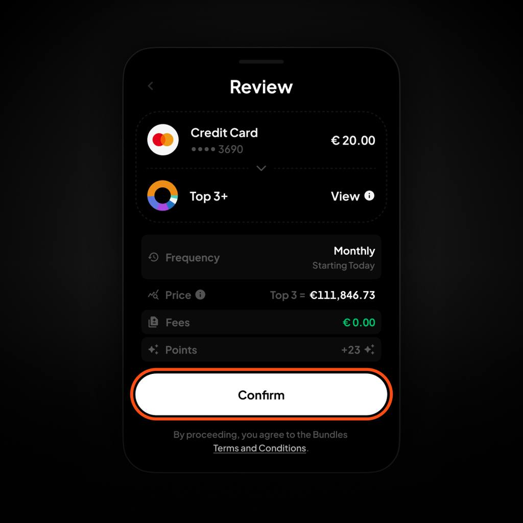 Each Bundle contains a predefined mix of crypto assets based on market criteria. When you buy a Bundle, you purchase all included assets in one transaction. The Bundle automatically rebalances every 30 days to maintain its target composition. Investments are held and tradable only in bundled form. Individual crypto assets within the bundle cannot be sold or redeemed separately. Bundle compositions are determined by market capitalization rankings from CoinMarketCap.
